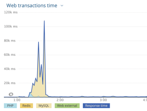 Klientas mus davė informaciją apie įvykį, kurio ateityje norėjo išvengti. Vienu metu monitoringo sistema fiksavo neproporcingai padidėjus transakcijos laikus, matėsi, kad didžiausią dalį laiko naudojo MySQL duomenų bazė, kuri nesugebėjo sutvarkyti su užklausų skaičiumi ir vienos užklausos apdorojimo laikas galėjo užtrukti iki 100 sekundžių. Joks vartotojas nelauks atsakymo į užklausą daugiau nei minutę.
